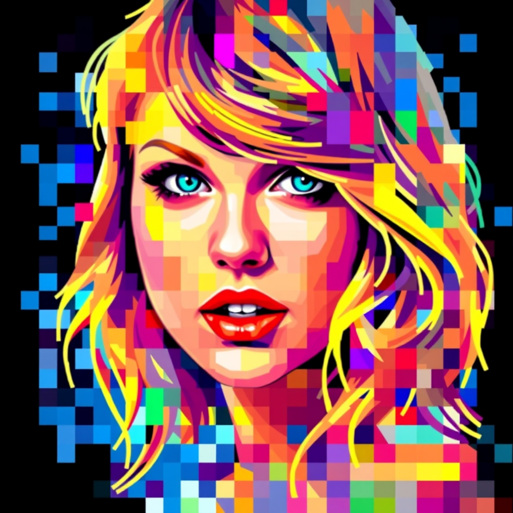 Taylor Swift portrait composed of vibrant, pixelated colors, blending her recognizable features with a mosaic-like, abstract style.