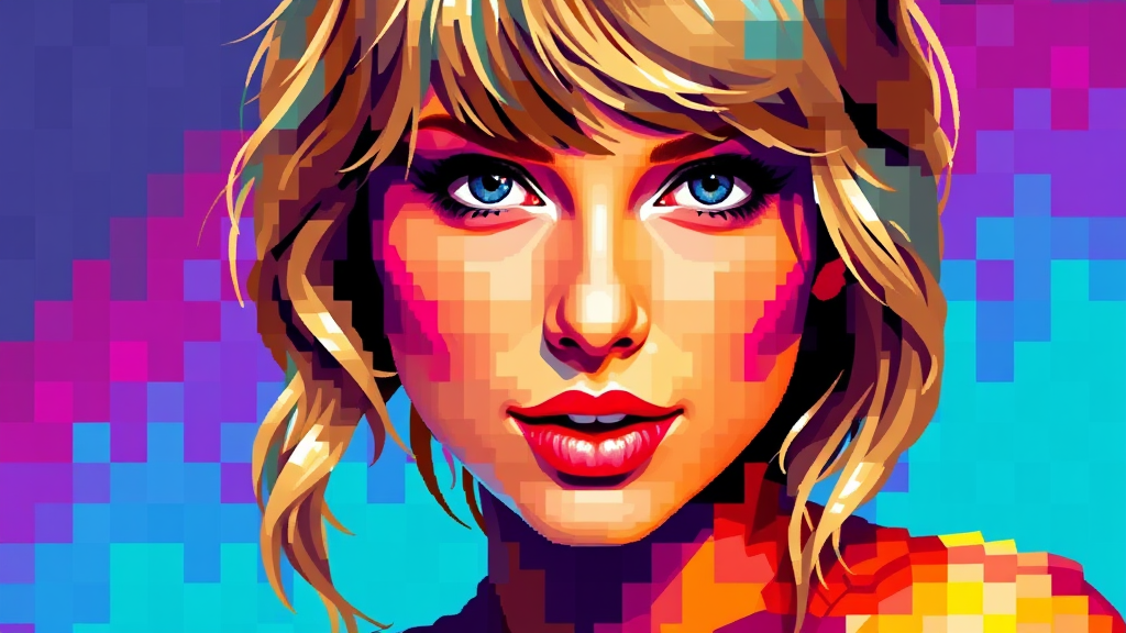 "Taylor Swift portrait rendered in a mosaic of vibrant colors, creating a pixel-like effect that blends hues seamlessly into her features."