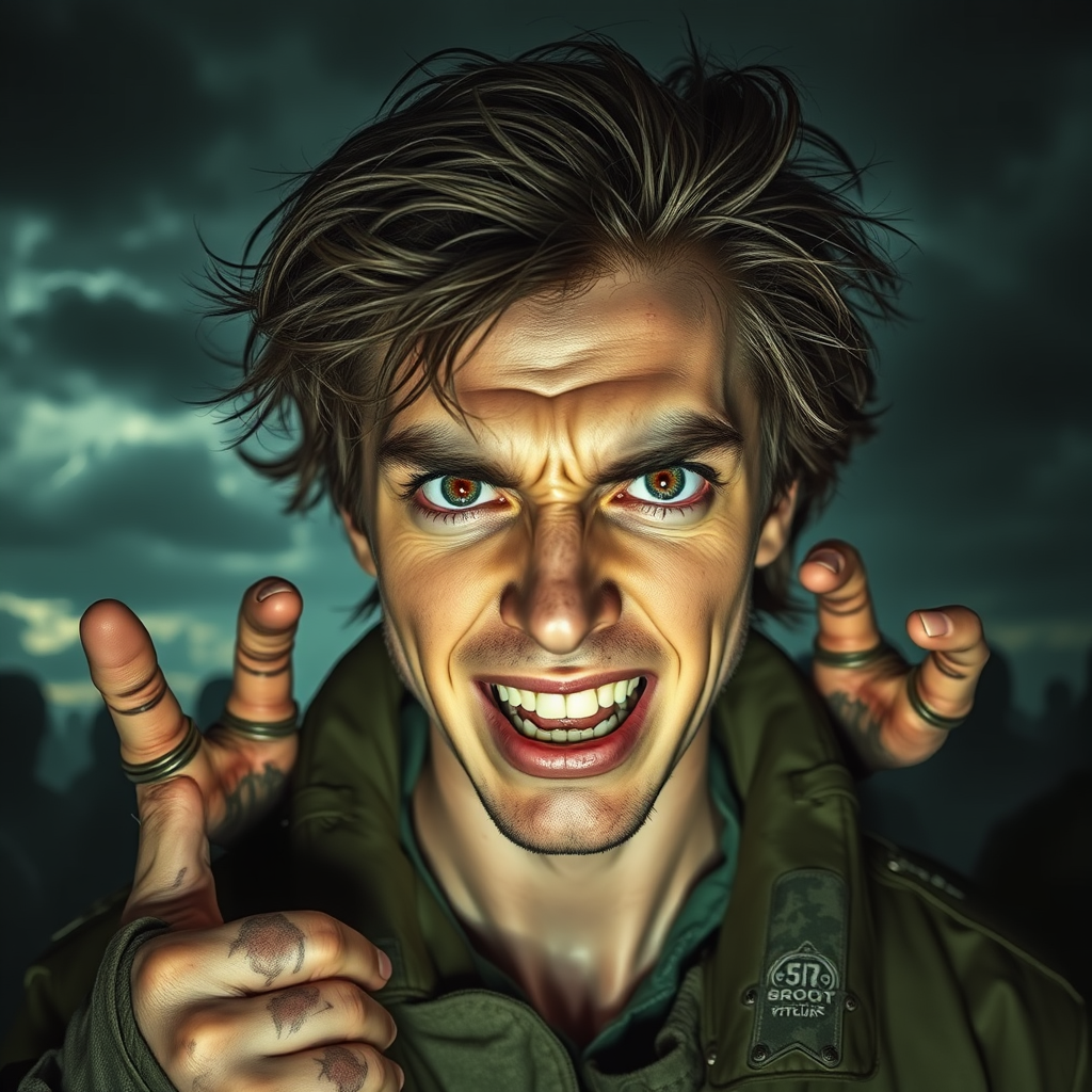 Technology, dark ambiance, furious energy, clear eyes, disheveled hair, angry expressions, gorgeous yet chaotic symmetry, intense, smooth complexion, pink eyes with a splash of rainbow, absurd yet intriguing, oddly humorous, smiling soldier, slightly unkempt, surprised face, embarrassed demeanor, highly detailed, hyper-realistic, ultra-detailed, photography, breathtaking environment reminiscent of old paint textures, stormy skies, dramatic composition, unusual angles, extra fingers and mutated hands as an artist's distortion, slightly out-of-frame elements, unique faces, bizarre proportions, blended beauty and distortion.