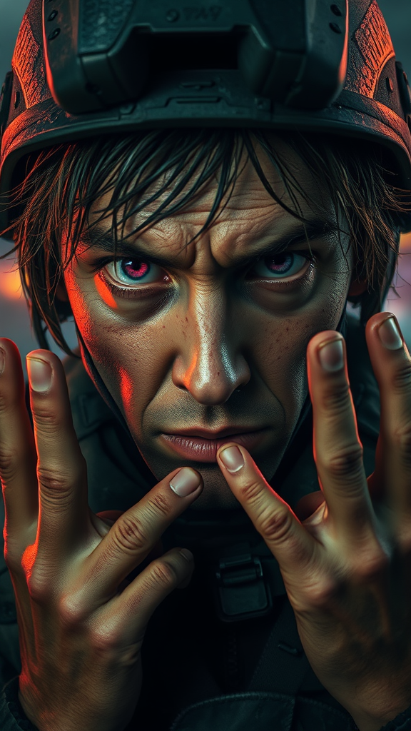 Technology, dark ambiance, intense emotions, clear eyes, disheveled and angry yet captivating, a touch of madness, smooth yet chaotic, the striking contrast of pink eyes against a vibrant rainbow backdrop, absurd and unexpected encounters, a soldier with a sloppy demeanor, a look of surprise and embarrassment etched into a highly detailed, hyperrealistic face. A stunning environment reminiscent of old paint artwork in the midst of a storm, where the image captures the essence of ultra-realism. Hands and limbs take on unusual forms, with elements fading out of focus, yielding a dreamlike, surreal quality. The scene teeters on the edge of beauty and distortion, embodying a paradoxical blend of the absurd and the extraordinary.