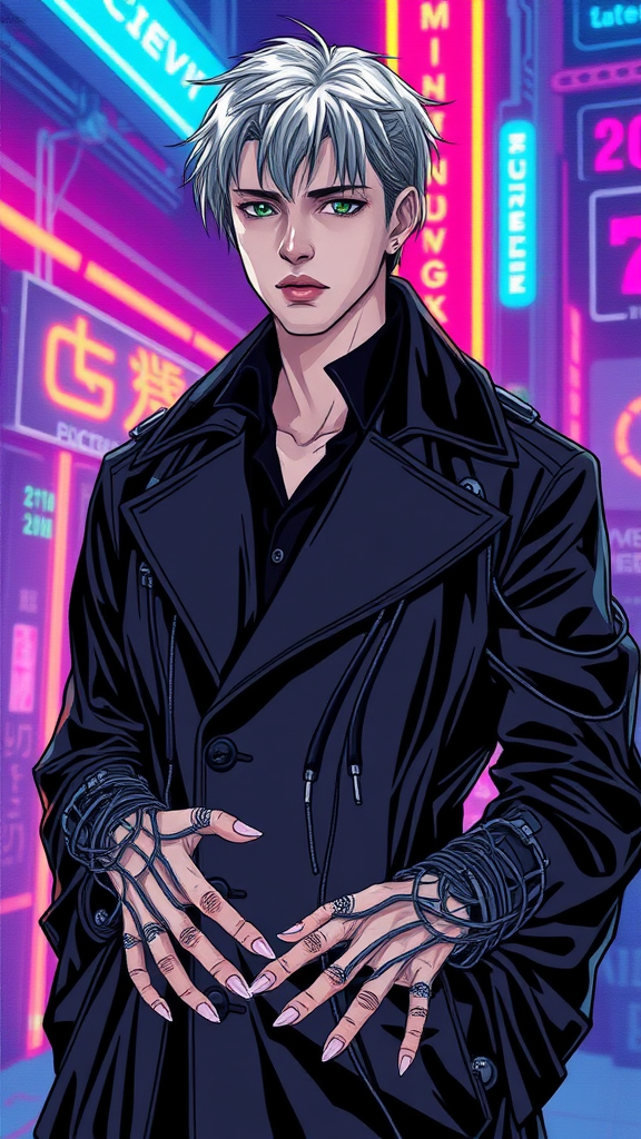 Technomancer in a sleek black trench coat with intricate cable wires entwined around their arms, featuring precise line art and symmetrical features. Set against a vibrant cyberpunk backdrop with neon lights, evoking the year 2077, fused with a biopunk aesthetic. The scene includes a low-resolution effect, with some missing and extra digits creating a sense of distortion. There's a hint of cropped elements, and subtle jpeg artifacts add to the digital ambiance. Anatomy is creatively altered, with extra limbs and unique hand structures, giving a surreal and mutated feel. The composition is slightly disfigured and out of frame, bordering on the abstract with hints of tiling. The artwork embraces a blurred and fuzzy style, evoking a strange, otherworldly beauty, devoid of any watermarks.