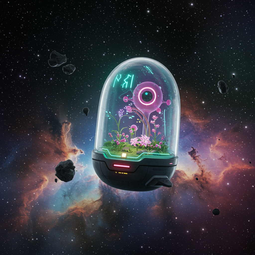 View this AI-generated image featuring in a universe teeming with life the cyber tamagushi emerges as a cutting edge companion blending ai sophistication with extraterrestrial charm encased in a sleek translucent shell that glows with alien runes it houses a vibrant digital ecosystem reflecting adva