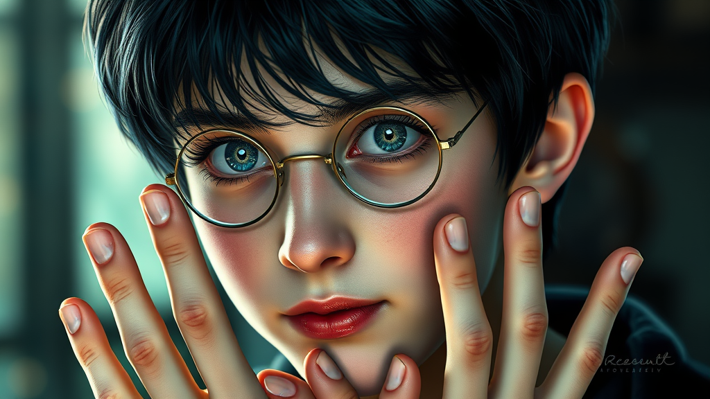 teen harry potter, 1boy, youthful presence, intricate details, ultra high quality resolution, dark black hair, slender build, fair skin, cinematic fantasy lighting, magical ambiance, digital art with a focus on detail, unusual duplicated eyes with slight distortions, transformed features with extra fingers, uniquely shaped hands, minor resolution flaws creating a dreamy effect, subtle feminine elements, exploring creative anatomy and whimsical charm.