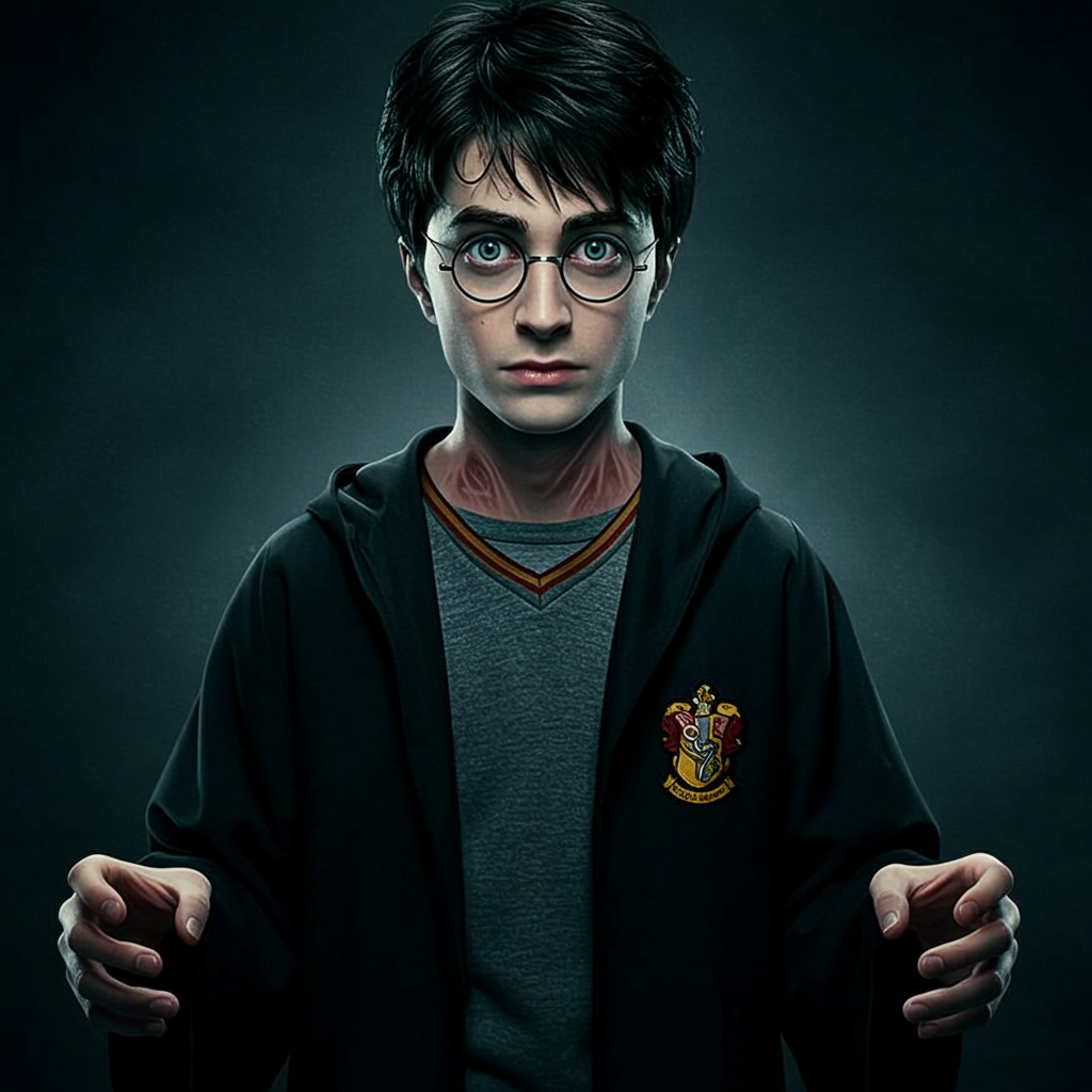 Teen Harry Potter, a young boy with black hair and light skin. He has a skinny build and is captured in ultra-resolution with ultra-quality. The image is set in a fantasy ambiance, enhanced by cinematic lighting, and showcases intricate details typical of digital art. The character features highly detailed duplicated eyes and malformed eyes, presenting a surreal appearance. His hands are mutated, with extra fingers and malformed aspects adding to the eerie aesthetic. Despite the overall low resolution, the image bears some jpeg artifacts. A subtle hint of femininity and a touch of bad anatomy contribute to the intriguing, otherworldly vibe.