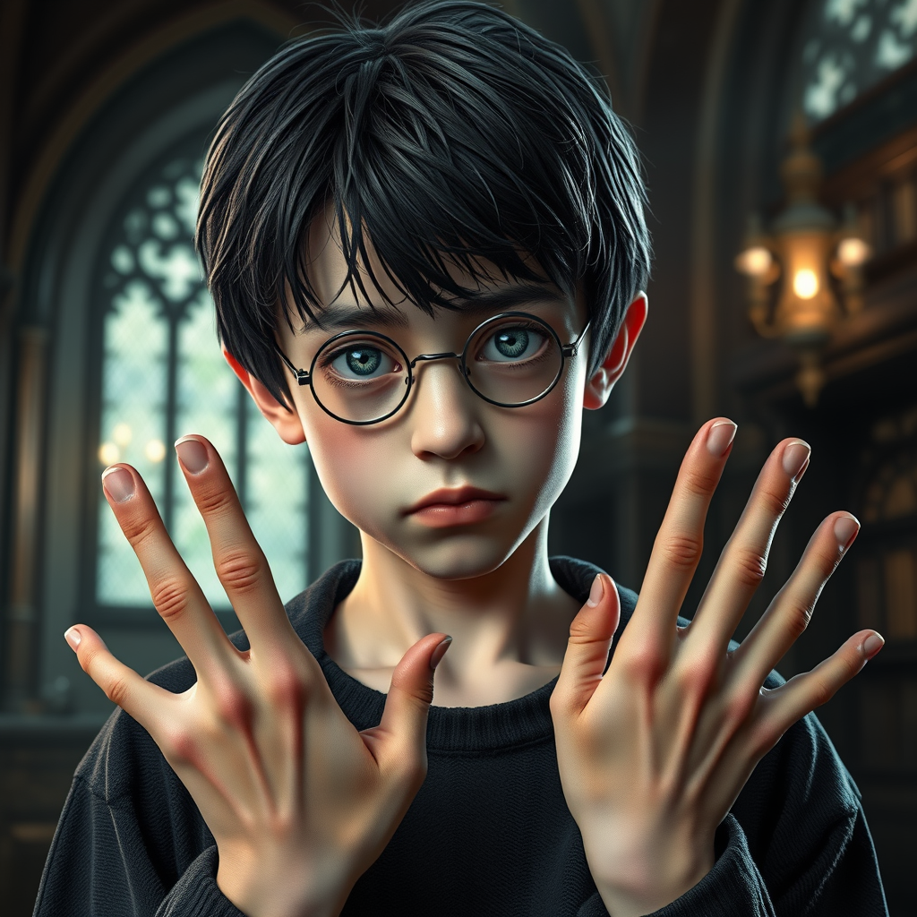 Teen Harry Potter, one young boy with black hair, light skin, and a skinny build, depicted in intricate detail and ultra resolution. The scene is set with cinematic lighting and a fantasy ambiance, captured in digital art. The character's eyes appear duplicated and malformed, adding an unusual and intriguing element. His hands are mutated with extra fingers, highlighting malformed anatomy. The overall image has a low-resolution touch with slight jpeg artifacts, and carries a subtle feminine quality, creating an intriguing blend of both genders.