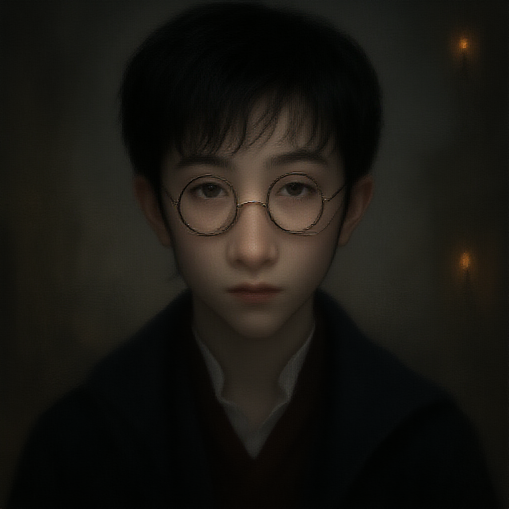Teen Harry Potter, young boy, black hair, light skin, cinematic lighting, fantasy ambiance, digital art, intricate details, ultra resolution, ultra quality. He has a slender build, with intense eyes that capture an otherworldly gaze. There is a surreal element to his appearance with duplicated and malformed features, adding a mysterious allure. The ambiance is rich and magical, with a hint of eeriness as his surroundings blend seamlessly into this fantastical world. Despite the low resolution and visible artifacts, the depth of detail and creativity paint a mesmerizing, otherworldly scene.