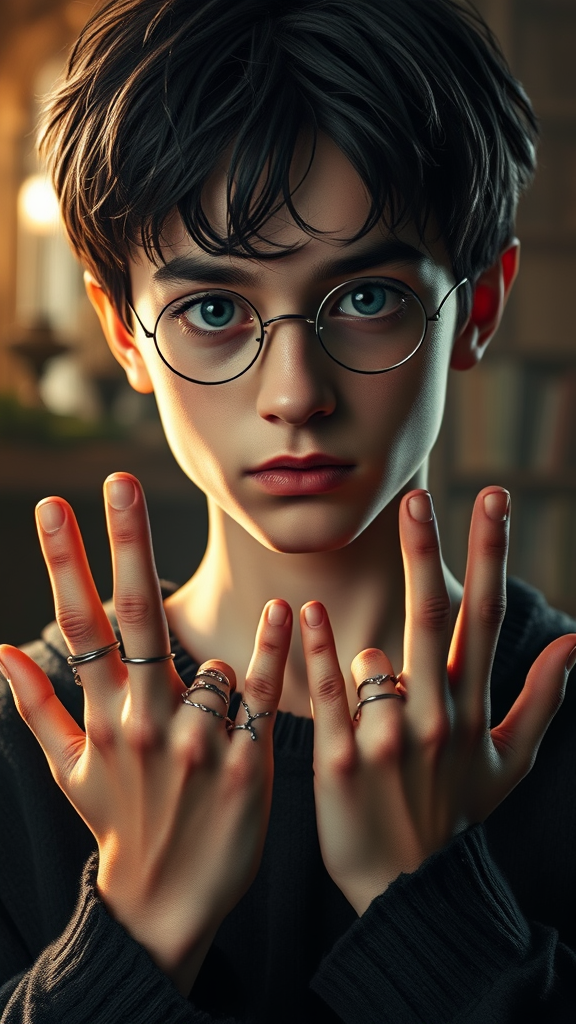teen harry potter, young boy with black hair and light skin, skinny build, captured in cinematic lighting within a fantasy ambiance, presented in digital art showcasing intricate details and ultra resolution. His features include highly detailed yet duplicated eyes that appear slightly malformed, along with uniquely mutated hands featuring extra fingers. The scene inadvertently contains elements of low resolution and jpeg artifacts, subtly blending in a feminine figure with unconventional anatomy, adding a layer of mystique and intrigue to the overall composition.