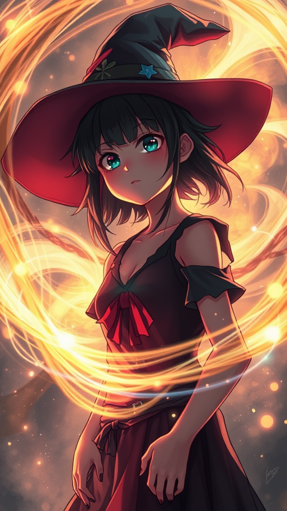 Teen witch entranced by swirled magic aura surrounding her body, cinematic lighting casting dramatic shadows, 8k resolution showcasing intricate details of her mesmerized expression and the radiant, glowing magic, artwork reminiscent of Granblue Fantasy, vibrant colors and sharp focus evoking a sense of wonder, background inspired by the fantastical worlds of Studio Ghibli, texture and depth of the scene drawing the viewer in, magic tendrils dancing around her body, sparkles and glints of light adding to the enchantment, signature of the artist subtly integrated into the design, teen witch's features accurately rendered, no disfigurements or mutations, standing proudly with her hands by her sides, completely absorbed in the magical energy enveloping her.