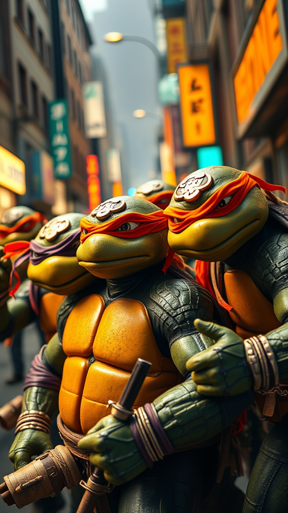 Teenage Mutant Ninja Turtles, dynamic group portrait, hyper-realistic, ultra-detailed image, captured with an 85mm lens, f4.6, soft bokeh effect, extremely precise detailing, dreamlike lighting, surreal urban setting, cinematic illusion, intricate textures, playful kitsch elements, vibrant energy, -- ar 50:80.