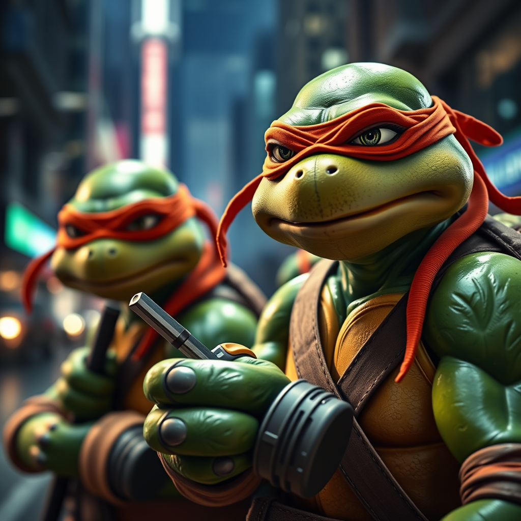 Teenage Mutant Ninja Turtles, expert portrait, hyper-realistic, ultra-detailed image, taken with an 85mm lens, f4.6 aperture, artistic bokeh, incredibly detailed, exceptionally precise features, surreal lighting, cityscape environment, ultra-unreal engine style, elaborate, whimsical pop culture, -- ar 51:81