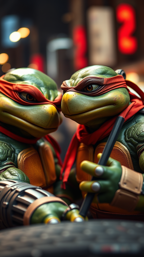 Teenage Mutant Ninja Turtles, expert portrait, hyper-realistic, ultra-detailed imagery, shot with an 85mm lens, f4.6, soft bokeh, exceptionally detailed, precisely accurate, bokeh lighting, infusion of surrealism, metropolitan backdrop, ultra-real engine inspiration, elaborate, whimsical, vivid colors, -- ar 51:81.
