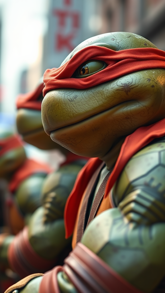 Teenage Mutant Ninja Turtles, professional portrait, hyper realistic, ultra detailed photograph, captured with an 85mm lens, f4.6, soft bokeh, exquisitely detailed, ultra accurate detailing, ambient bokeh lighting, touch of surrealism, vibrant urban setting, ultra unreal engine aesthetics, intricately designed, slight retro kitsch elements, -- ar 51:81.