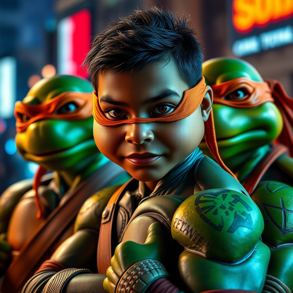 Teenage Mutant Ninja Turtles, professional portrait, hyper realistic, ultra detailed photograph captured with an 85mm lens, f4.6, vivid bokeh, meticulously detailed, strikingly accurate depiction, surreal lighting, urban landscape backdrop, rendered with an ultra-real engine, intricately designed, retro-futuristic vibe, vibrant colors, dynamic posture, youthful energy.