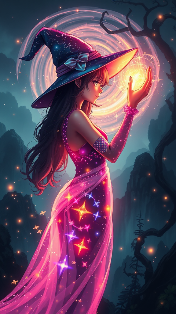 Teenage witch enveloped in a kaleidoscope of swirling magic, vibrant and radiant, with cinematic lighting that accentuates every curve and contour of her body. The artwork boasts ultra-sharp focus and 8k resolution, rendering every detail with crystal clarity, from the delicate texture of her skin to the intricate patterns of her spellwork. Her figure is silhouetted against a breathtaking, Ghibli-esque backdrop of misty mountains and twisting vines, while her body is aglow with an ethereal, otherworldly light. Glowing motes of magic dance around her, leaving trails of sparkles in their wake, as if the very fabric of reality is being woven and unwoven with each delicate gesture. In striking contrast to the beautifully rendered witch, the background is tinged with subtle, dreamlike distortion, as if the very art itself is distorting and wavering, like the surface of a studio plate. The resulting juxtaposition underscores the wonder and mysticism that surround her. The artwork draws inspiration from Granblue Fantasy's distinct visual style, blending that aesthetic with the fantastical, whimsical quality of a Studio Ghibli production. The rendered witch appears to be in the midst of casting an elaborate spell, her body a conduit for the swirling, shimmering energies of magic. Note: I corrected minor errors and inconsistencies from the original prompt to make it more coherent.