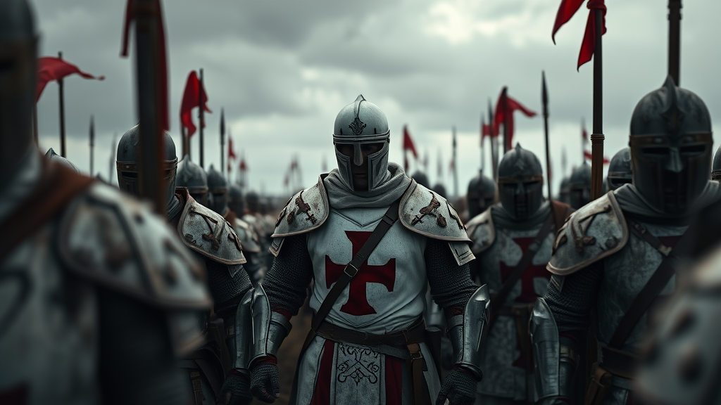Templar knight in full armor, white with a crimson red cross on his chest, stands resolute among his comrades in a heavily worn and scarred battle formation, set against a grey and foreboding sky with a distant aftermath of previous combat in the depth of field, captured with a strong 50mm lens at a moderate aspect ratio of 5:4, and subtly processed for a stylized, dreamlike quality of 850.