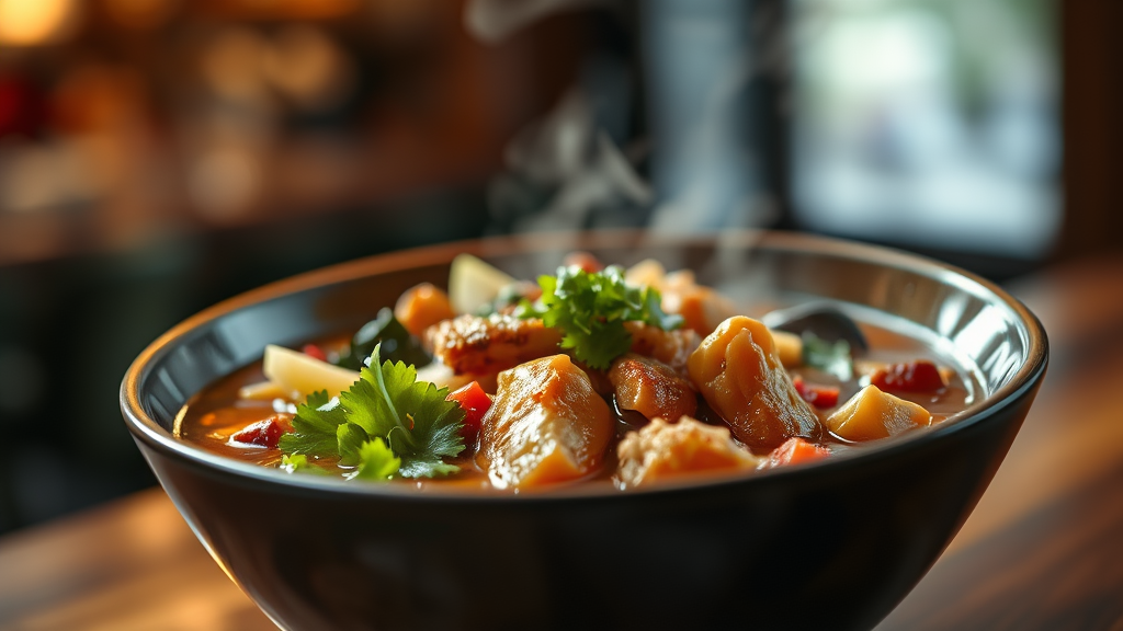 Teriyaki Chicken Noodle Soup beautifully presented in a deep plate, capturing the essence of a masterpiece in high definition. The rich colors of the soup and its ingredients pop in exquisite detail against a softly blurred bokeh backdrop, highlighting the steaming broth, tender chicken, and vibrant vegetables. Cinematic lighting enhances the dish's allure, creating a warm and inviting atmosphere. The focus remains entirely on the food, emphasizing its high quality and artful presentation, free from any distractions.