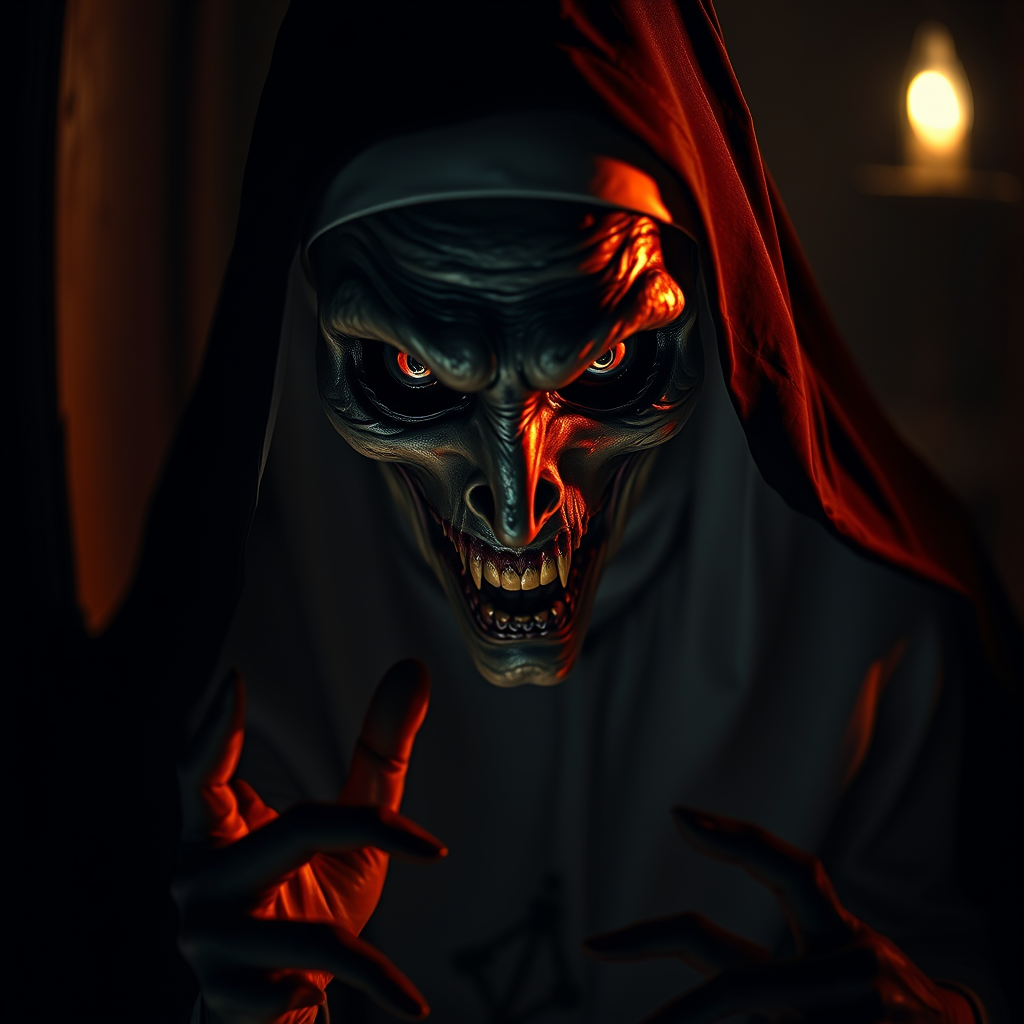 Terrifying nun with a sinister aura, unnerving and malevolent, lurking in shadows, surrounded by eerie and ghastly presence, intricate and detailed design, captured with dramatic and moody photography lighting, photorealistic and cinematic style, ultra-high definition quality with a focus on a chilling and dark atmosphere in 9:16 aspect ratio.