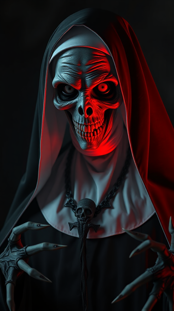 Terrifying nun with an unholy aura, exuding an eerie and creepy presence, surrounded by dark, ghastly elements, with an intricate and detailed design, captured under dramatic photography lighting, photorealistic and cinematic in essence, rendered in high-definition 8k -- captured in a 9:16 aspect ratio.