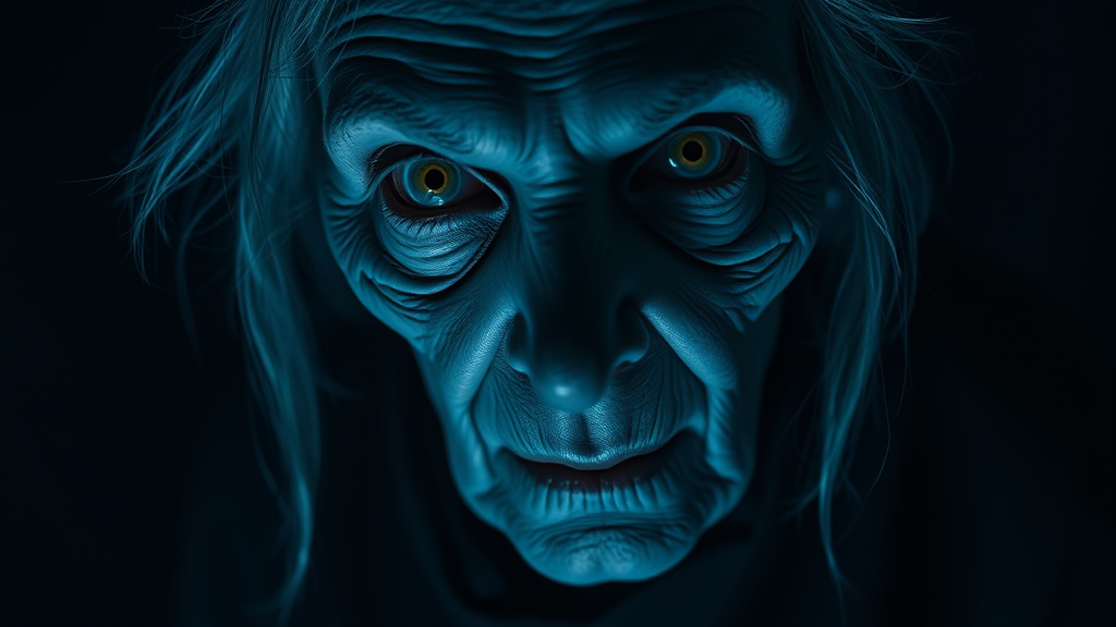 Terrifying sinister elderly female specter, dark backdrop, glaring white eyes, eerie blue-grey illumination accentuating facial features, extreme close-up, horror, ominous and unnerving vibe, hyperrealistic, intricately detailed, 8k resolution, vertical aspect ratio, high-quality render, intensely atmospheric.