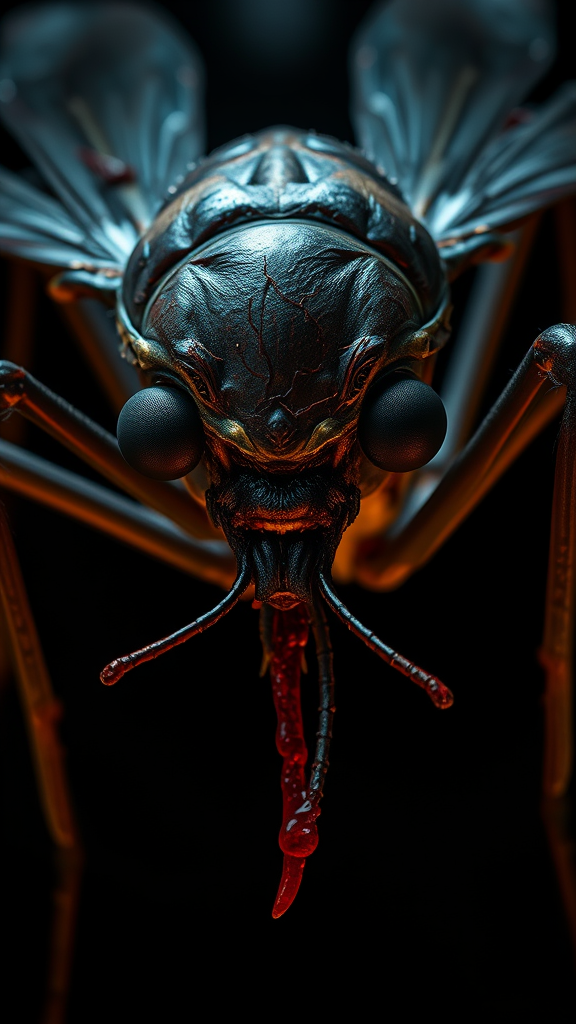 terrifyingly realistic mosquito, illuminated by eerie natural light, intricately detailed skin, unsettling atmosphere, horror elements, glistening with fresh blood, soulless black eyes, covered in scars, shadowy backdrop, menacing fangs, intense close-up view
