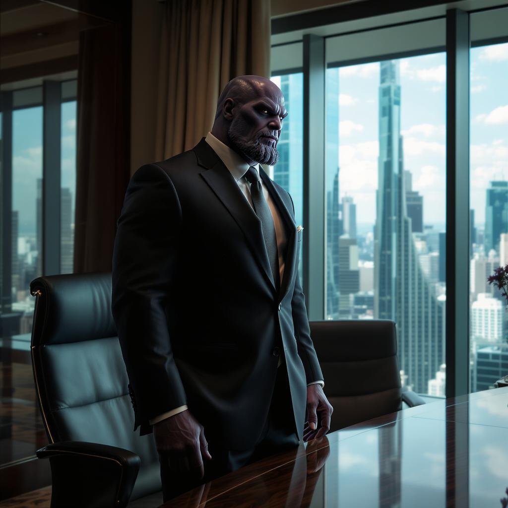 Thanos, a powerful and enigmatic businessman, stands in his luxurious corner office, the dramatic light casting deep shadows across his chiseled features. His eyes, both calculating and determined, survey the bustling cityscape through expansive floor-to-ceiling windows. Dressed in a tailored, dark suit that symbolizes his authority and ambition, Thanos exudes an aura of quiet confidence and strategic brilliance. The subtle reflections of skyscrapers on the polished mahogany conference table mirror his vision for a balanced, yet ruthless approach to global business domination.