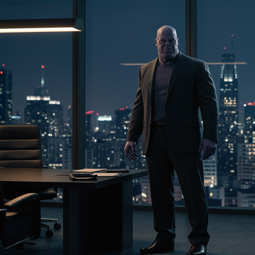 Thanos, a powerful CEO, stands in his sleek, modern office, the dramatic lighting casting sharp shadows across his chiseled features. His presence commands the room, as the city skyline twinkles through floor-to-ceiling windows behind him. Dressed in an impeccably tailored suit, he reviews world-altering business strategies with a calm, calculated demeanor. His confident posture and piercing gaze reflect years of relentless ambition, as if the fate of the world rest in his hands.