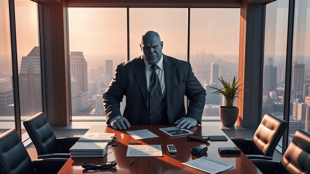 Thanos, clad in a tailored suit, towers over a sleek conference room with a panoramic city view, his expression focused and intense as natural light pours dramatically through floor-to-ceiling windows, casting sharp shadows on his chiseled features and illuminating the polished wooden table scattered with strategic business plans and infinity gauntlet-inspired gadgets, his iron-clad resolve emanating a formidable presence as he thoughtfully contemplates the future of his corporate empire.
