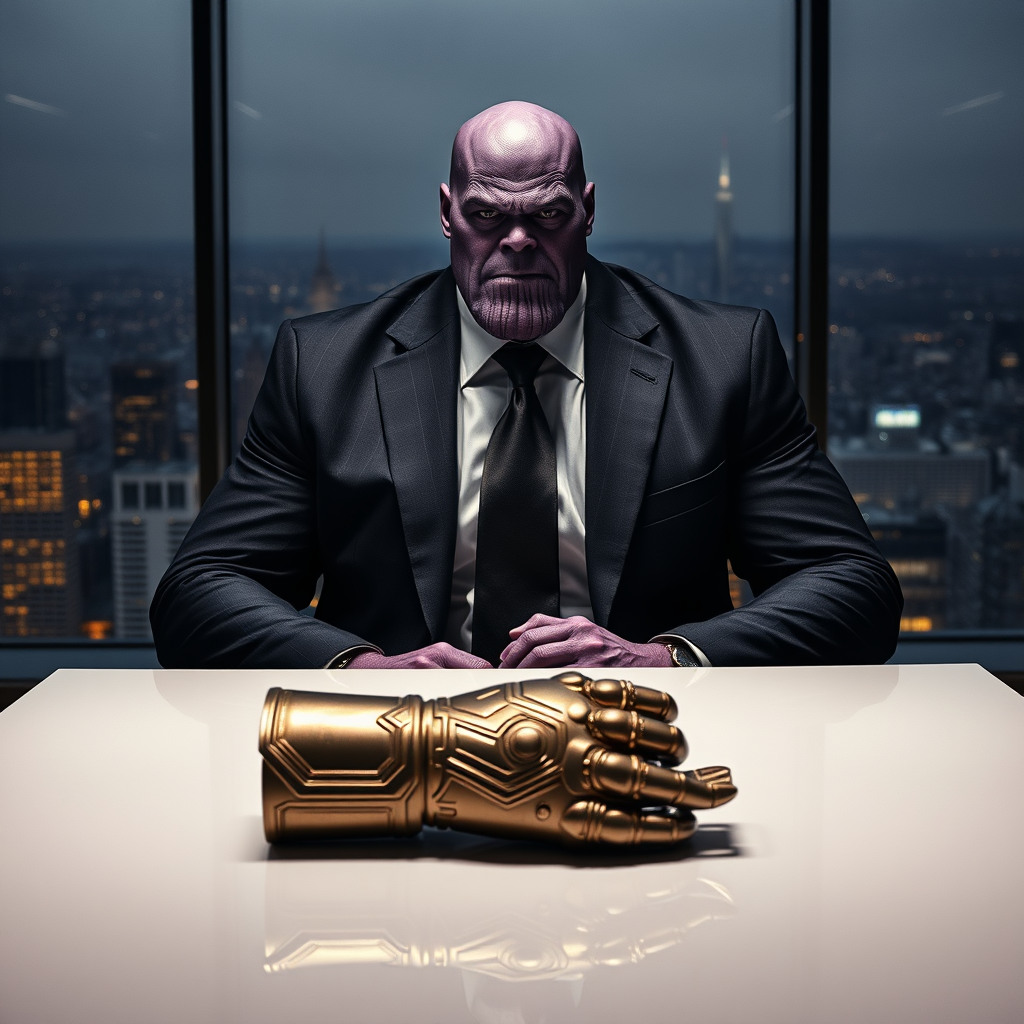 Thanos, dressed in an impeccably tailored business suit, sits at the head of a sleek conference table, his imposing figure dominating the modern office space. The room is bathed in dramatic, low lighting, casting deep shadows that accentuate his stern, calculating gaze. Behind him, floor-to-ceiling windows reveal a sprawling cityscape, hinting at the vast empire he controls. On the table before him lies a gleaming, intricately designed gauntlet, understated yet unmistakably powerful, symbolizing his unparalleled influence in the corporate world. His expression is one of relentless ambition and strategic foresight, as he contemplates his next move in the high-stakes environment of international business.
