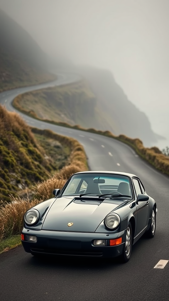 The 1995 Porsche 911, a masterpiece of timeless design, glides gracefully along an early morning coastal mountain road. Its sleek black exterior, highlighted by elegant silver accents, shines in pristine condition, exuding an aura of refined sophistication. The ambience is enveloped in misty fog, with dewy grass lining the winding route, adding an ethereal quality to the scene. Captured through the lens of a moody editorial style, the image resonates with a vintage feel, bringing the classic Porsche to life in stunning 4K quality. Inspired by the works of Jeff Zwart, the photograph is a testament to superb craftsmanship and the enduring allure of the iconic 911, perfectly blending realism and artistic expression. Realistic superb quality 4K classic cars Porsche 911 editorial photography.