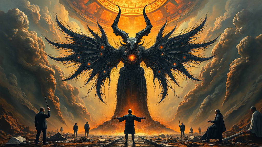 The AGI Entity, Moloch, The Moloch Dilemma captures the destructive cycles born from conflicting incentives and unforeseen impacts within intricate systems, like artificial general intelligence, a relentless beast demanding endless offerings for the sake of offerings. States of Entropy, and the Byzantine Generals Conundrum, Grand Composition, ultra-futuristic Tenebrism, monumental scale, neo-apocalyptic, oil on board, a vision of chaos in balance.