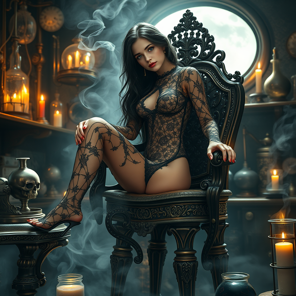 The alchemist girl in a black lace spider web bodysuit sits atop a high, ornate chair in her mystical laboratory, surrounded by peculiar contraptions and mysterious creatures. Her dark hair cascades down her back like a waterfall of night, framing her heart-shaped face and piercing emerald eyes that sparkle like the stars on a clear night. A delicate spider web pattern of intricate lace wraps around her curves, leaving little to the imagination. She wears a scandalous, revealing pose, with one leg bent and her foot resting on a nearby pedestal, while the other leg extends behind her, the movement fluid and alluring. The air is thick with the sweet scent of amber smoke that swirls around her, imbuing the atmosphere with an otherworldly mystique. The soft glow of candles and a faint moonlight seep into the room, casting a mesmerizing dance of shadows on the walls. Her hourglass figure is beautifully accentuated by the tight, lacy bodysuit, which highlights her porcelain skin and delicate collarbone. A delicate golden chain rests around her neck, supporting a small, ornate vial that seems to contain a swirling, ethereal liquid.