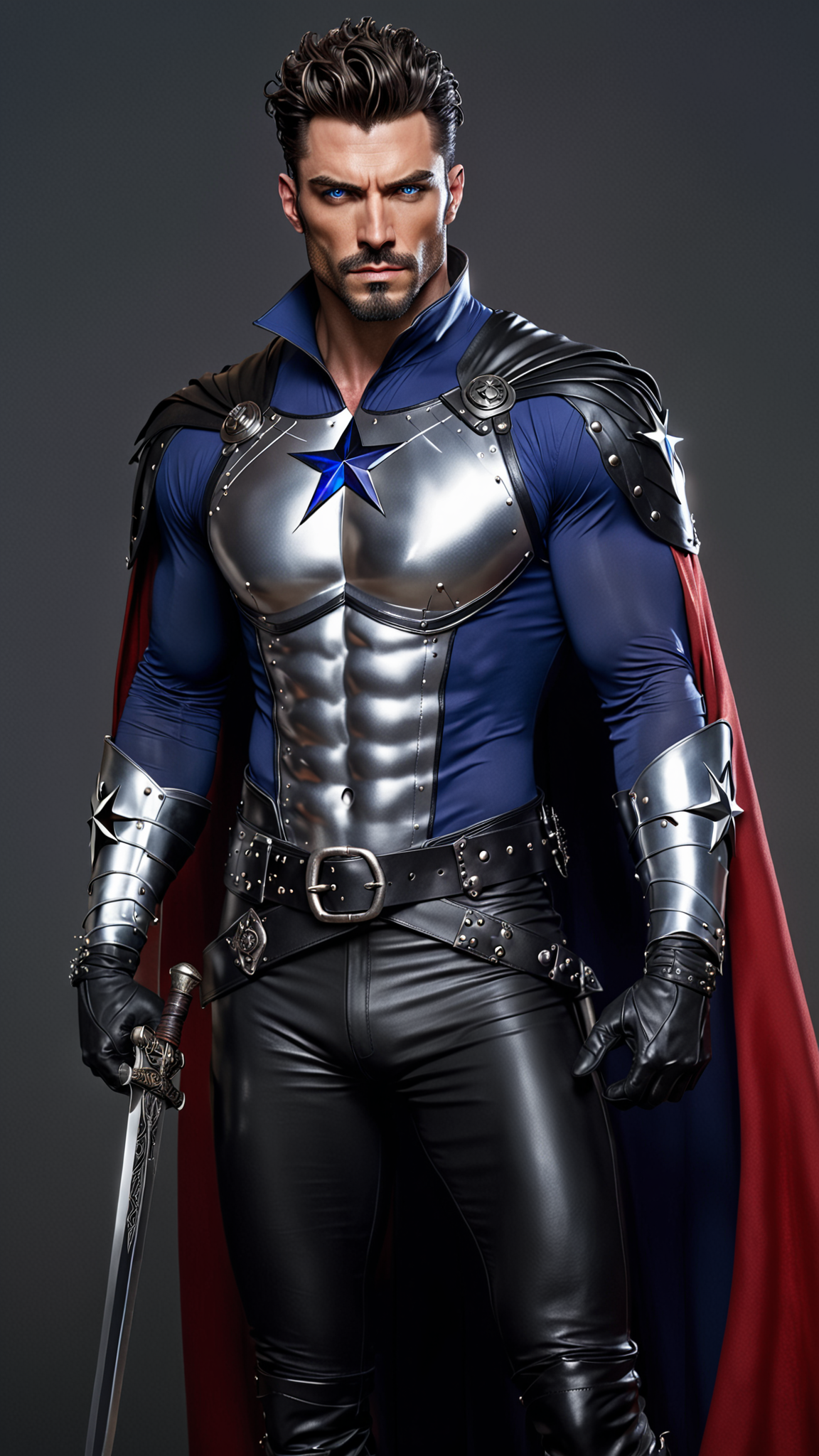 The American Revolution meets Sci-Fi. Hypermasculine, Caucasian male. Blacksmith, sword fighter. Tall, muscular, sinewy, strong, broad chest, wide shoulders and back, narrow waist. Handsome rugged face, strong brow and jaw, strong chin. Lapis blue eyes with thick silver eyebrows. Silver goatee on face, well trimmed. Medium length silver hair, wavy pompadour cut short on sides and back, tousled on top. Eight-pointed black star tattoo over the left eye. Black leather harness across his bare muscular chest, buckled on the right side. Large silver metal pauldrons and shoulder pads on both shoulders. Scarlet red tights/pants with white shooting star symbols down the sides of his thighs, stretched over muscular legs and a bulging crotch. Black leather bucket boots, turned down at the knees. Black leather gloves, turned down at the elbows. A wide silver tech belt with black accents around his waist, meeting at a v-shape above his crotch. A short royal blue cape with a white shooting-star symbol, split down the back to resemble wings. He wields a huge silver electrified techno shortsword, electric voltage emitting from the blade. He also carries a techno shield, transparent and also electrified. full body pose.