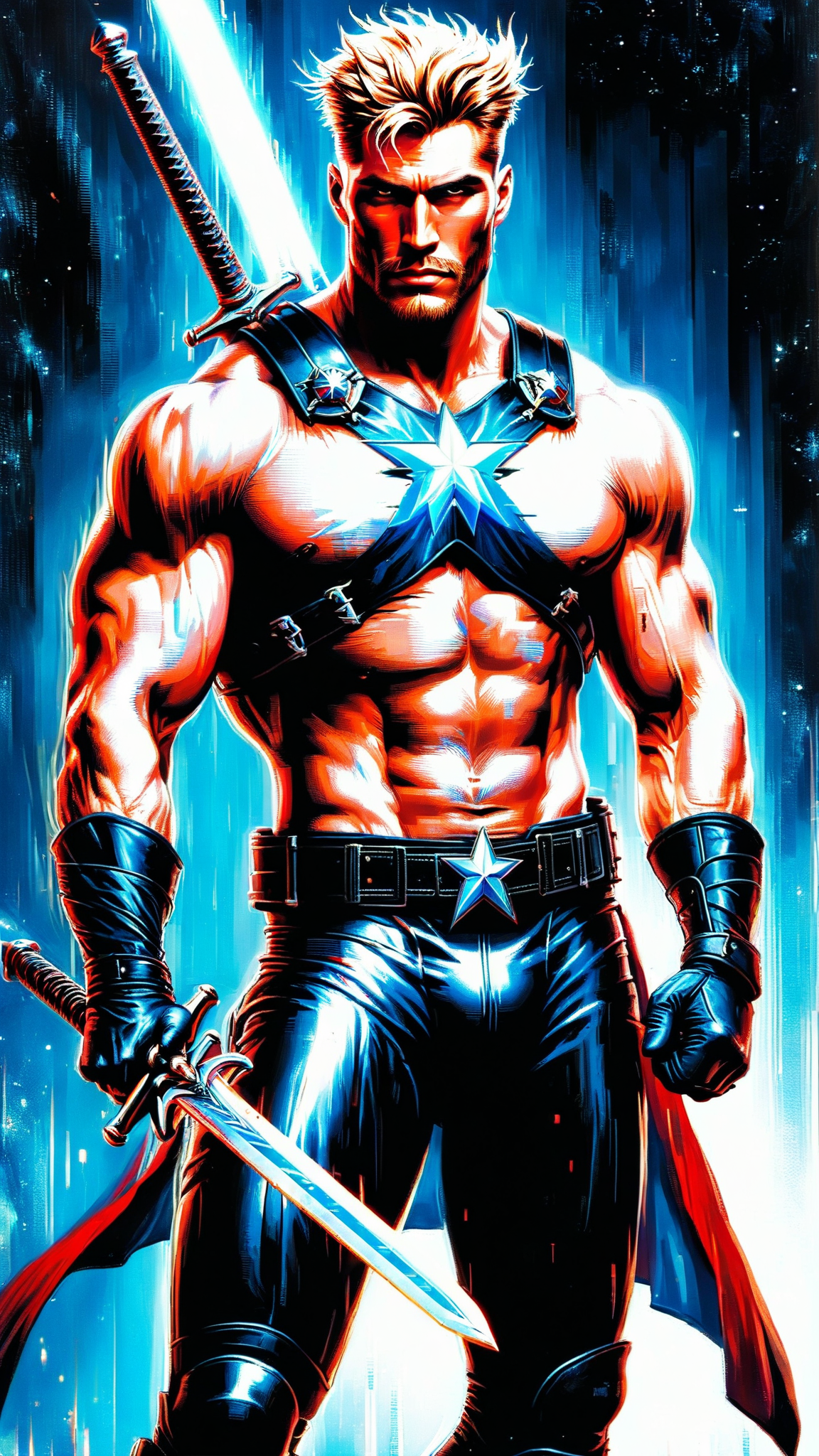 The American Revolution meets Sci-Fi. Hypermasculine, Caucasian male. Blacksmith, sword fighter. Tall, muscular, sinewy, strong, broad chest, wide shoulders and back, narrow waist. Handsome rugged face, strong brow and jaw, strong chin. Lapis blue eyes with thick silver eyebrows. Silver goatee on face, well trimmed. Medium length silver hair, wavy pompadour cut short on sides and back, tousled on top. Eight-pointed black star tattoo over the left eye. Black leather harness across his bare muscular chest, buckled on the right side. Large silver metal pauldrons and shoulder pads on both shoulders. Scarlet red tights/pants with white shooting star symbols down the sides of his thighs, stretched over muscular legs and a bulging crotch. Black leather bucket boots, turned down at the knees. Black leather gloves, turned down at the elbows. A wide silver tech belt with black accents around his waist, meeting at a v-shape above his crotch. A short royal blue cape with a white shooting-star symbol, split down the back to resemble wings. He wields a huge silver electrified techno shortsword, electric voltage emitting from the blade. He also carries a techno shield, transparent and also electrified. full body pose.