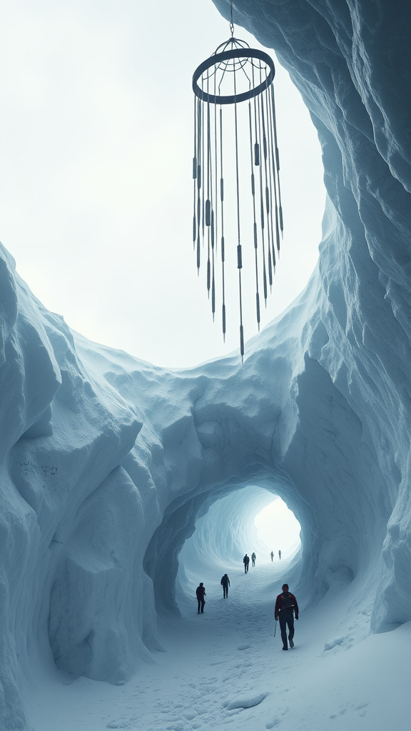 The ancient wind chimes swayed gently in the tranquil overcast sky, a luminous glow emanating softly from my ears, with glaciers whispering in the distance, steadily advancing towards me. Intricate intersecting tunnels beneath Antarctica echo with the crack of thin ice, as numerous figures navigate these mesmerizing and awe-inspiring passages, reminiscent of a fantasy digital art creation in octane render.