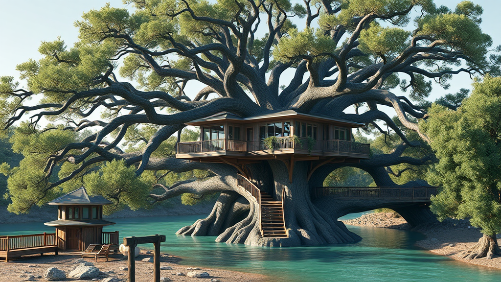 The Angel Oak tree house, an intricately ornate treehouse nestled within a stunning massive turquoise Angel Oak, perched gracefully on the banks of a river with crystal-clear water, featuring professional architecture and design. Rendered using photorealistic 3D techniques, this high-quality, detailed representation was crafted using tools like 3D Studio Max and V-Ray by creative minds such as Emmanuel Lubezki, Antonio J. Manzanedo, Alberto Vargas, and Mark Simonetti. The treehouse showcases realistic materials and precise dimensions, offering multiple angles and perspective views that capture its award-winning essence. Adding unique creative touches, the treehouse integrates modern elements while retaining its natural allure, forming a harmonious connection with the surrounding environment.