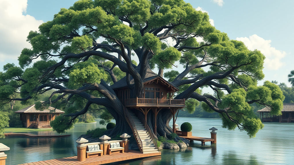 The Angel Oak tree house is an intricately ornate treehouse nestled within a magnificent, gigantic turquoise Angel Oak, situated on the banks of a river with crystal-clear water. This concept is envisioned through professional architecture rendering, providing a photorealistic, high-quality, and detailed 3D representation. Utilizing tools like 3D Studio Max and V-Ray, this depiction incorporates the expertise of artists like Emmanuel Lubezki, Antonio J. Manzanedo, Alberto Vargas, and Mark Simonetti, ensuring realistic materials and accurate dimensions. The design is captured from multiple angles and perspective views to emphasize its architectural prowess, creating a visually stunning and captivating scene.