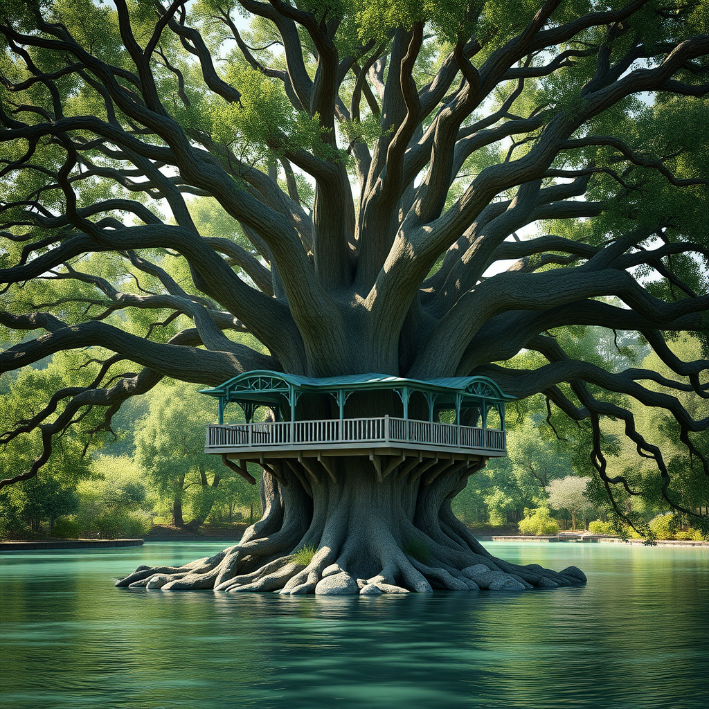 The Angel Oak tree house nestled within a sprawling, magnificent turquoise Angel Oak, situated along the banks of a river with crystal-clear water. This intricately ornate structure features professional architecture rendered to perfection, combining photorealistic 3D artistry with high-quality, detailed and accurate representation. Crafted using 3D Studio Max and V-Ray, the tree house boasts professional, corporate design elements, reminiscent of award-winning works by Emmanuel Lubezki, Antonio J. Manzanedo, Alberto Vargas, and Mark Simonetti. Featuring realistic materials and precise dimensions, the tree house is captured from multiple angles and perspective views, showcasing its unique integration with the natural environment. Subtle creative twists include slight variations in texture and dimension, while maintaining a realistic and immersive experience.