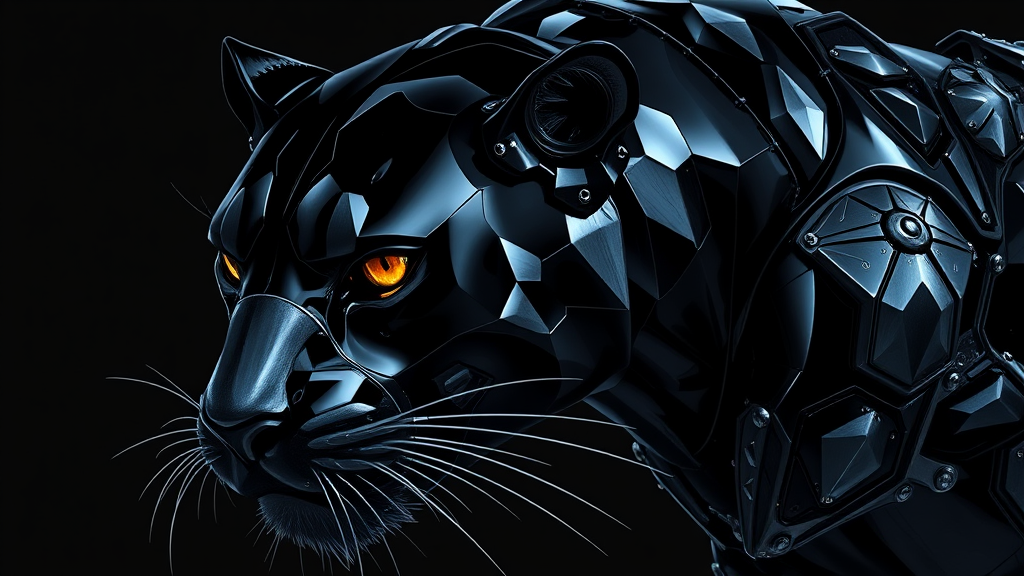 The animal black panther intricately designed in liquid metal armor, exhibiting fluid dynamic brushwork with contrasting dark and deep black hues, resembling UE5 aesthetics, featuring sharp angles in a close-up view, embodying changelingcore with a touch of mystique. The composition focuses on elegance and power, highlighting the sleek and agile form of the panther, with metallic reflections accentuating its fierce presence.