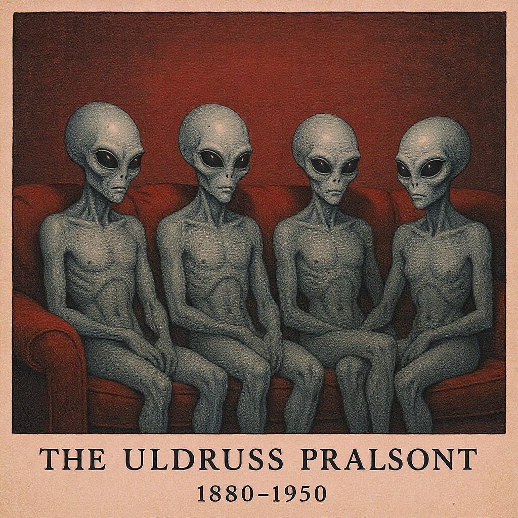 The artwork depicts a quartet of extraterrestrial beings relaxing on a couch, featuring trompe-l'œil illusionistic detail that highlights their presentation of humanoid shapes, set against a backdrop of deep crimson and pale azure hues, reminiscent of American prints from the early 20th century, specifically 1880–1950, with a cinematic aspect ratio of 128:77, executed in a contemporary style.