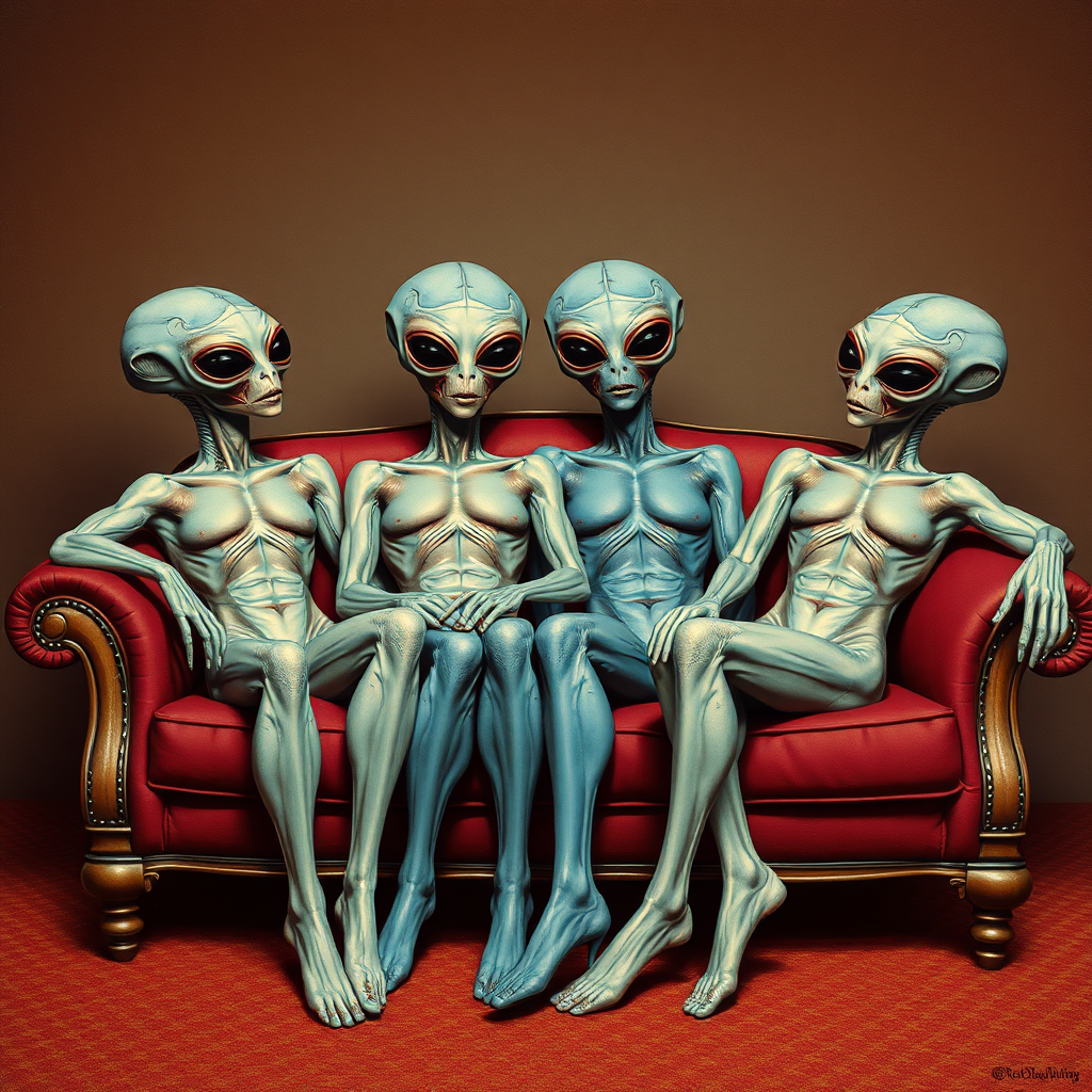 The artwork depicts four extraterrestrial beings lounging on a couch, crafted in the style of trompe-l'œil, featuring intricate illusionistic detail and a keen interpretation of the human form. The color palette blends rich maroon with soft azure, reminiscent of American prints from the early 20th century.