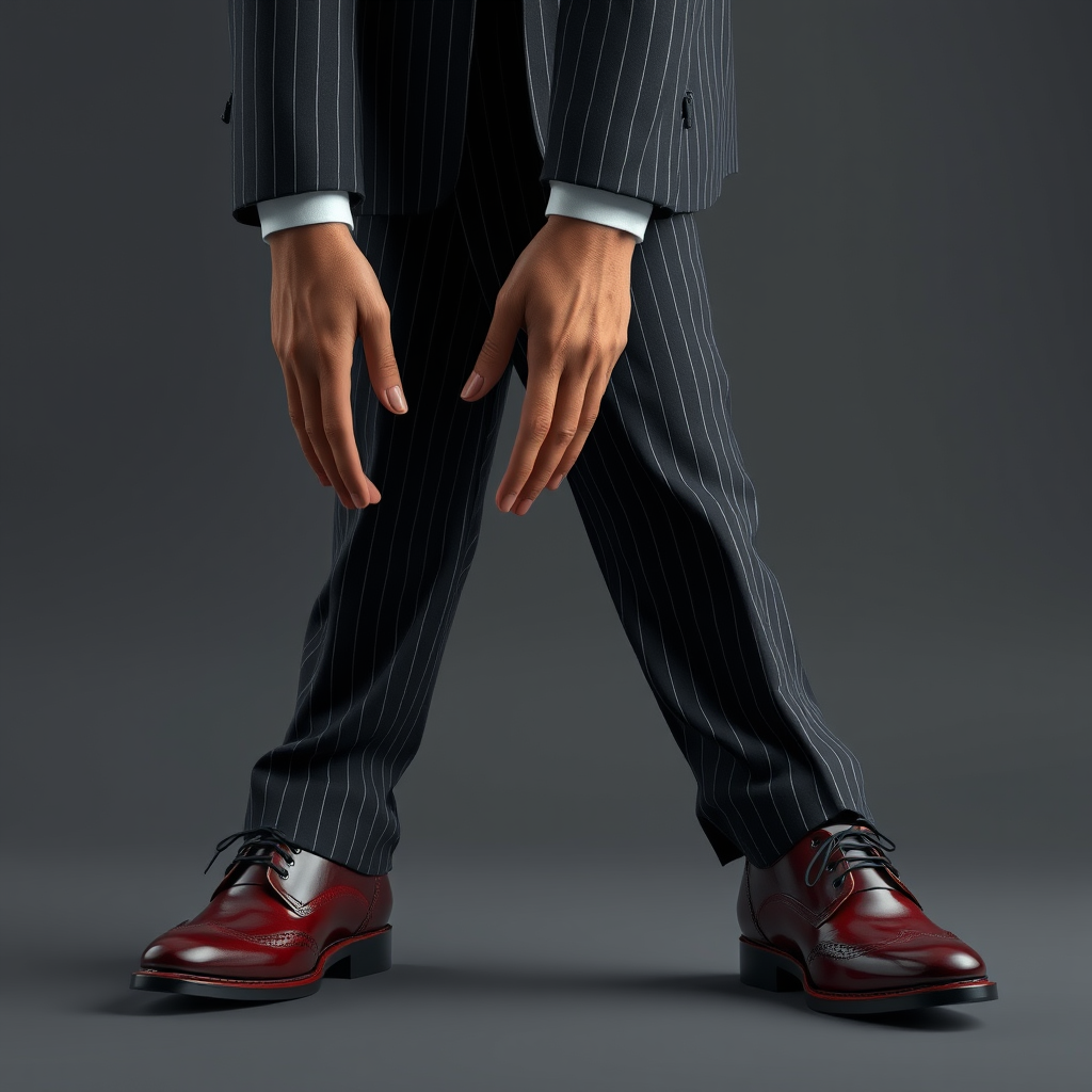 The artwork exhibits an extraordinary level of craftsmanship, capturing every detail from the sharp lines of the pinstripe suit to the delicate stitching on the shoes. Each element is precisely designed, resulting in a stunning masterpiece that evokes awe and admiration from every viewer. The 3D render, created using CGI and octane technology, demonstrates exquisite attention to detail, despite its low resolution and presence of jpeg artifacts. There is an intriguing contrast between the realistic portrayal of the attire and the slightly abstract features, such as asymmetric hands and elongated proportions, lending a unique character to the piece. These creative quirks, alongside minor imperfections, contribute to the overall charm and allure of the artwork, making it both captivating and memorable.