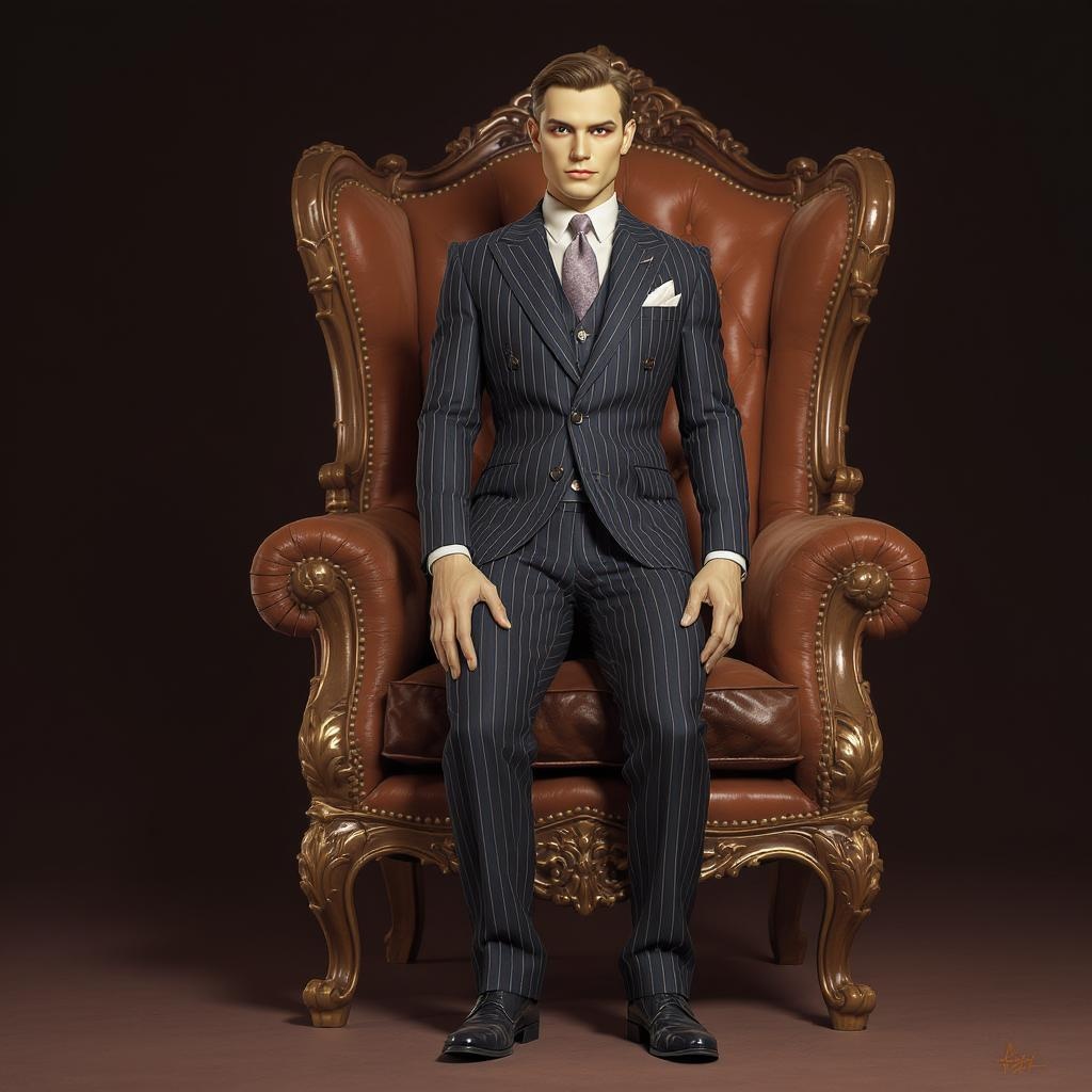 The artwork exhibits an extraordinary level of craftsmanship, with each element thoughtfully designed, from the precise pinstripes on the suit to the detailed stitching on the footwear. The dedication to detail reaches an unmatched level, culminating in a stunning masterpiece that evokes awe and admiration in every observer. CGI, 3D, doll, Octane, render, low resolution, text errors, cropped visuals, inferior quality, JPEG artifacts, unattractive aspects, repetition, unsettling features, distorted and out-of-frame elements, additional fingers, altered or malformed hands, poorly rendered hands and faces, mutations, blurry visuals, incorrect anatomy, disproportionate features, extra or missing limbs, duplicated facial features, disfigurement, unpleasant proportions, malformed extremities, fused digits, excessive fingers, and elongated neck.