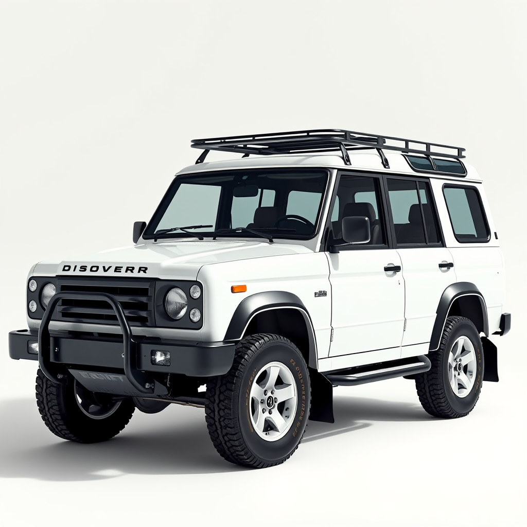 The artwork features a dazzling portrait of a white SUV, complete with a sleek roof rack, captured in exquisite detail. Created in a style reminiscent of Richard Carline, this piece merges Renaissance art influences with the dynamic energy of the 90s, specifically evoking the essence of the iconic Discovery One SUV. Set against a pristine white backdrop, the hyper-realistic SUV commands attention, evoking the spirit of a thrilling safari adventure. The image, created using a unique Polaroid-inspired rendering technique, highlights the vehicle in a striking half-turn position that embodies the essence of exploration and discovery. Celebrating a special milestone or achievement, the artwork captures the luxury and rugged appeal of this adventure-ready icon. Presented in a cinematic 16:9 aspect ratio, the piece is a perfect addition for display, radiating a timeless charm and adventurous spirit.