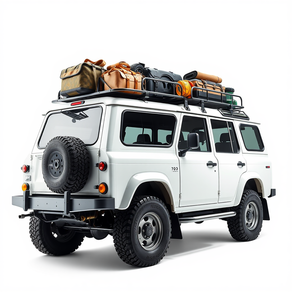 The artwork features a striking portrait of a pristine white SUV, complete with a robust roof rack filled with adventure gear, set against a simplistic white background that accentuates its detailed and hyper-realistic rendering. Inspired by painter Richard Carline and echoing elements of Renaissance art, the SUV captures the spirit of exploration with its nod to the iconic 90s Discovery One, evoking a sense of nostalgia and resilience. The vehicle is captured in a dynamic half-turn stance, conveying momentum and the thrill of a safari expedition. The composition suggests it could be a celebratory piece, possibly marking a significant milestone or anniversary, fitting for display on a wall. The use of a Polaroid octane render invites a vivid, almost tangible quality, and the artwork is crafted in a 16:9 aspect ratio, enhancing its cinematic allure. Subtle creative touches, such as a slightly weathered appearance on the tires hinting at previous adventures, inject authentic charm while keeping the core theme of adventure and exploration intact.
