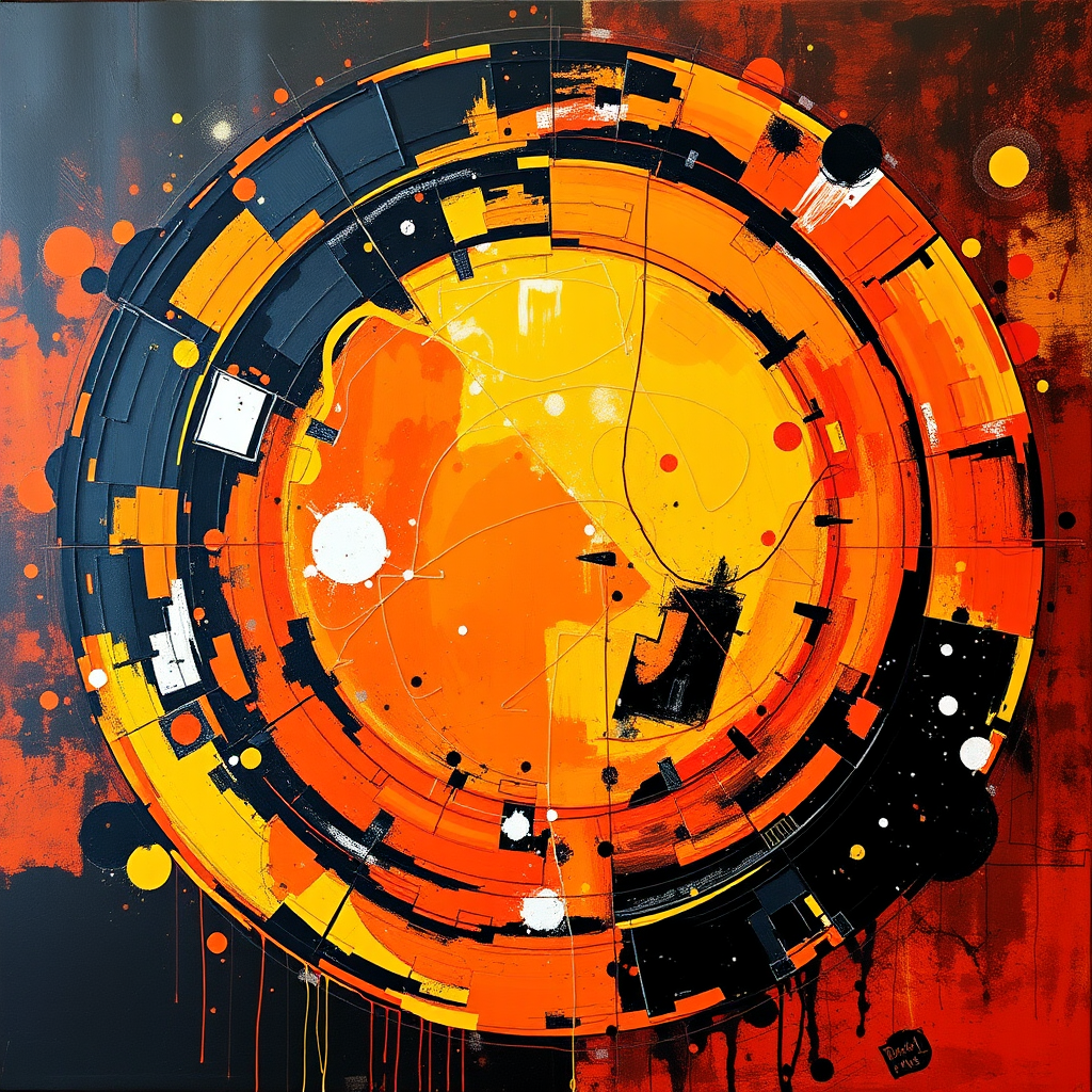 The artwork features a vibrant palette of orange, black, and yellow, echoing intricate compositions with touches of soft white and subtle red. It showcases a circular abstraction, reminiscent of Dmitry Spiros, blending industrial textures and precise balance. The piece embodies the essence of hard edge painting, maintaining harmony in its proportions while introducing dynamic, creative variations to the original inspiration.