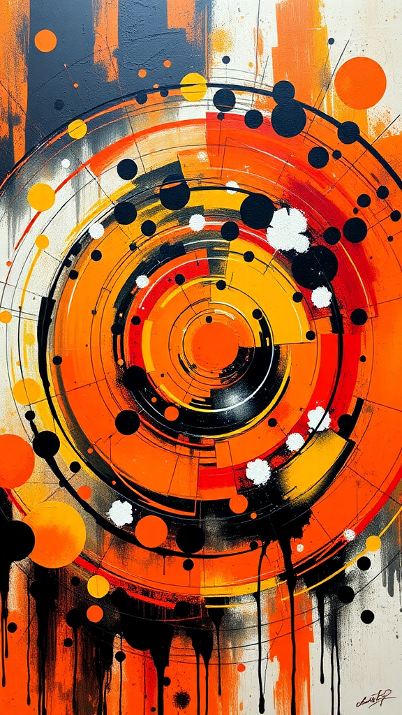 The artwork features an intricate composition dominated by vibrant hues of orange, deep black, and luminous yellow, blending with subtle hints of dark white and pale red. This piece draws inspiration from the circular abstraction style reminiscent of Dmitry Spiros, incorporating industrial materials to emphasize its contemporary charm. With balanced proportions and a hard-edge painting technique, the visual narrative captures a dynamic equilibrium.