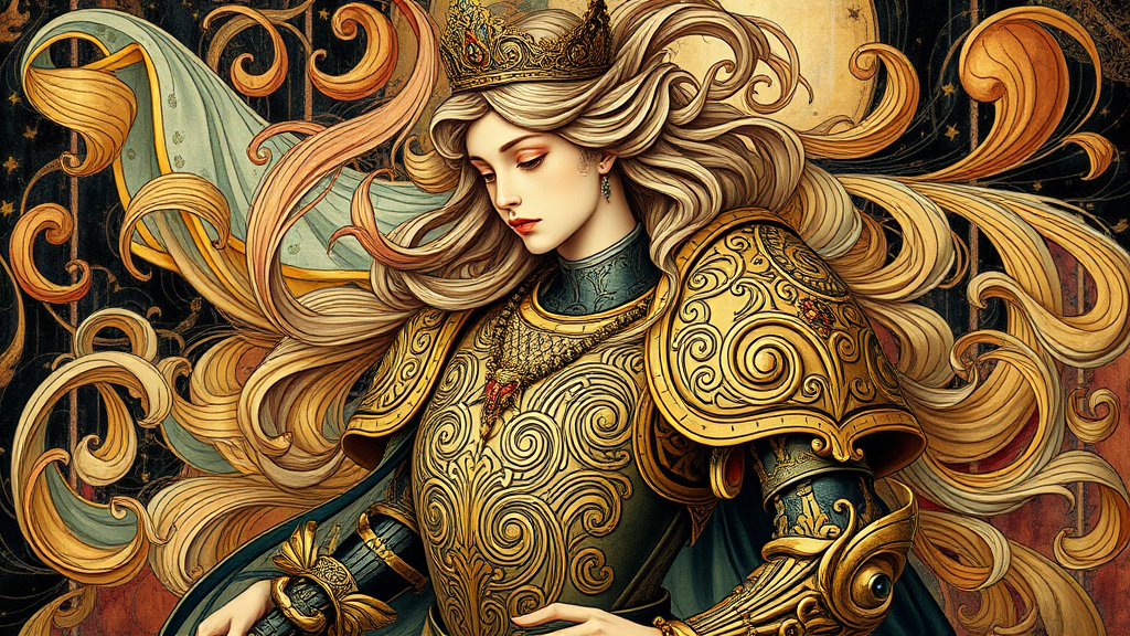 The artwork is a breathtaking blend of diverse styles and techniques, merging elements of Art Nouveau, Baroque, and Rococo. The Princess's armor is adorned with the flowing patterns and natural forms characteristic of Art Nouveau, while the lavishness and majestic detail typical of Baroque and Rococo dominate the entire composition. Swirling lines dance across the canvas, crafting a scene where elegance and extravagance coexist in perfect harmony.