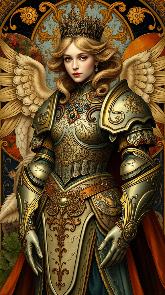 The artwork is a captivating blend of diverse styles and techniques, integrating features of Art Nouveau, Baroque, and Rococo. The Princess's armor showcases the flowing patterns and natural forms characteristic of Art Nouveau, while the lavishness and splendor of Baroque and Rococo are reflected in the grandiose overall composition.
