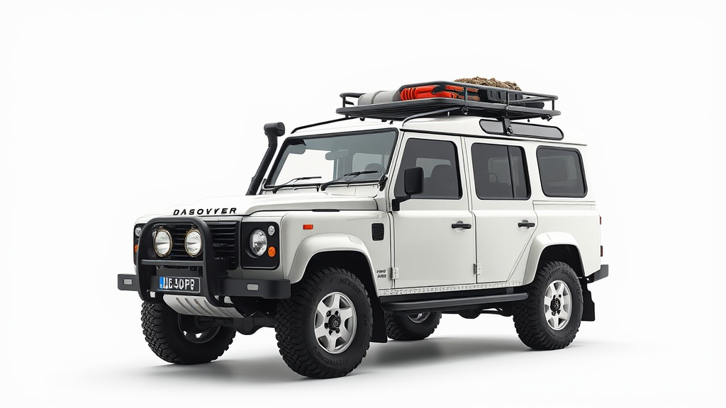 The artwork is a captivating portrait of a sleek white SUV equipped with a robust roof rack, capturing the spirit of exploration and adventure. Inspired by Richard Carline's touch, this piece intertwines elements of Renaissance art with a homage to vintage automotive aesthetics. The SUV, reminiscent of the iconic 90s Discovery One, is envisioned on a grand safari quest, exuding an air of nostalgia and adventure. Set against a pristine white background, the viewer's attention is drawn to the SUV's intricate and hyper-realistic features, crafted using a luminous Polaroid octane render. Presented in a cinematic 16:9 aspect ratio, the vehicle is positioned in a dynamic half-turn, symbolizing motion and discovery. Celebrating a milestone or significant achievement in adventure gear history, this artwork serves as a perfect centerpiece for a wall display, inviting viewers to embark on their own journeys.