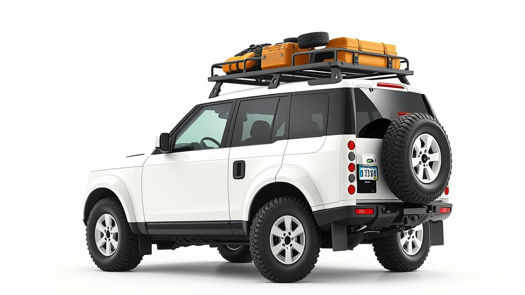 The artwork is a captivating portrait of a white SUV, finely detailed with a roof rack equipped for adventure. Inspired by Richard Carline's style and drawing from Renaissance art, the image presents a hyper-realistic depiction of the SUV on a safari expedition. Set against a crisp, white background, the focus is entirely on the SUV’s intricate features. Echoing the 90s aesthetic, reminiscent of the iconic Discovery One SUV, the artwork might utilize a Polaroid octane render technique and is designed in a widescreen 16:9 aspect ratio. Celebrating a milestone or significant anniversary, the vehicle is shown in a dynamic half-turn pose, enhancing the adventurous spirit of the scene. This unique piece is fitting for prominent display, capturing the essence of exploration and innovation.